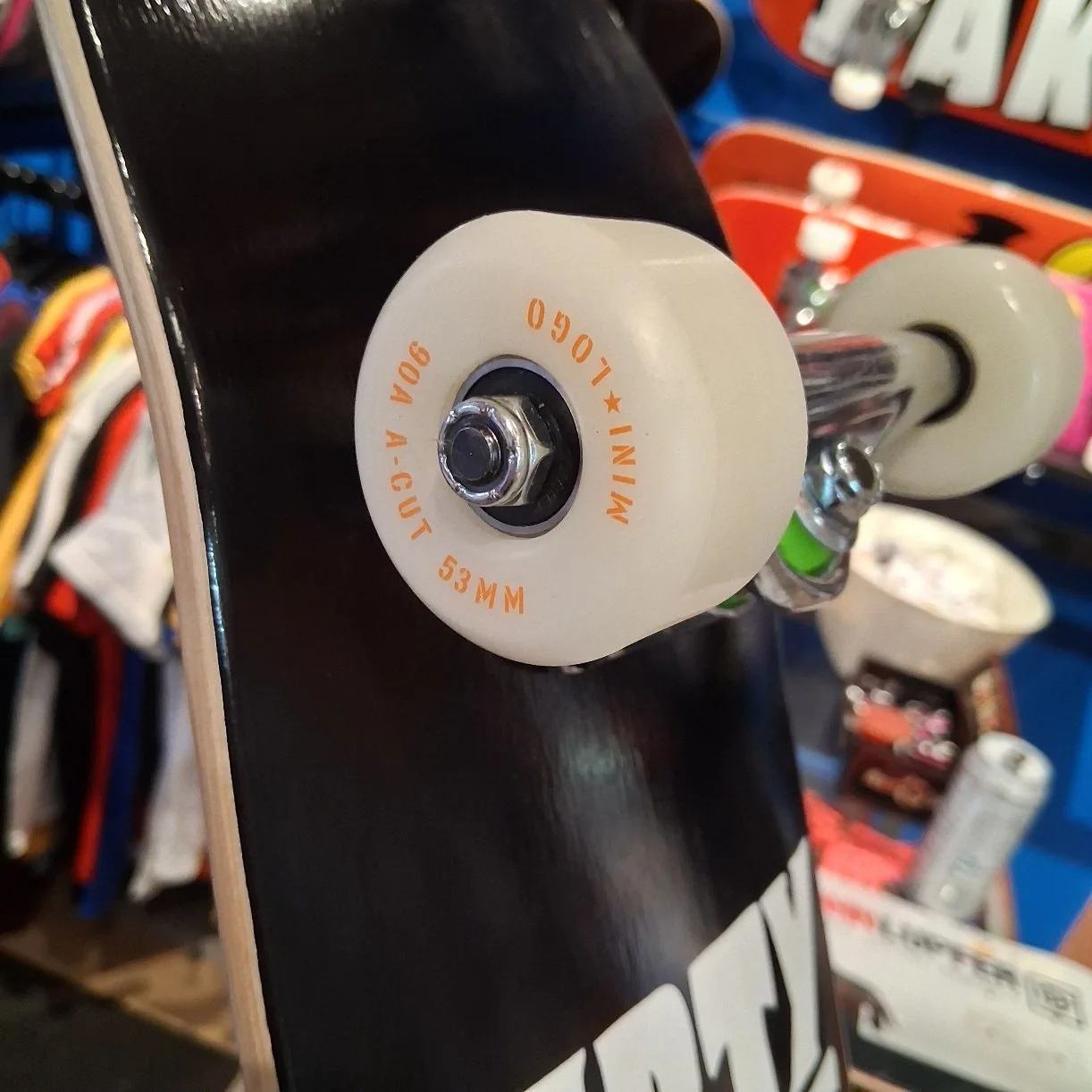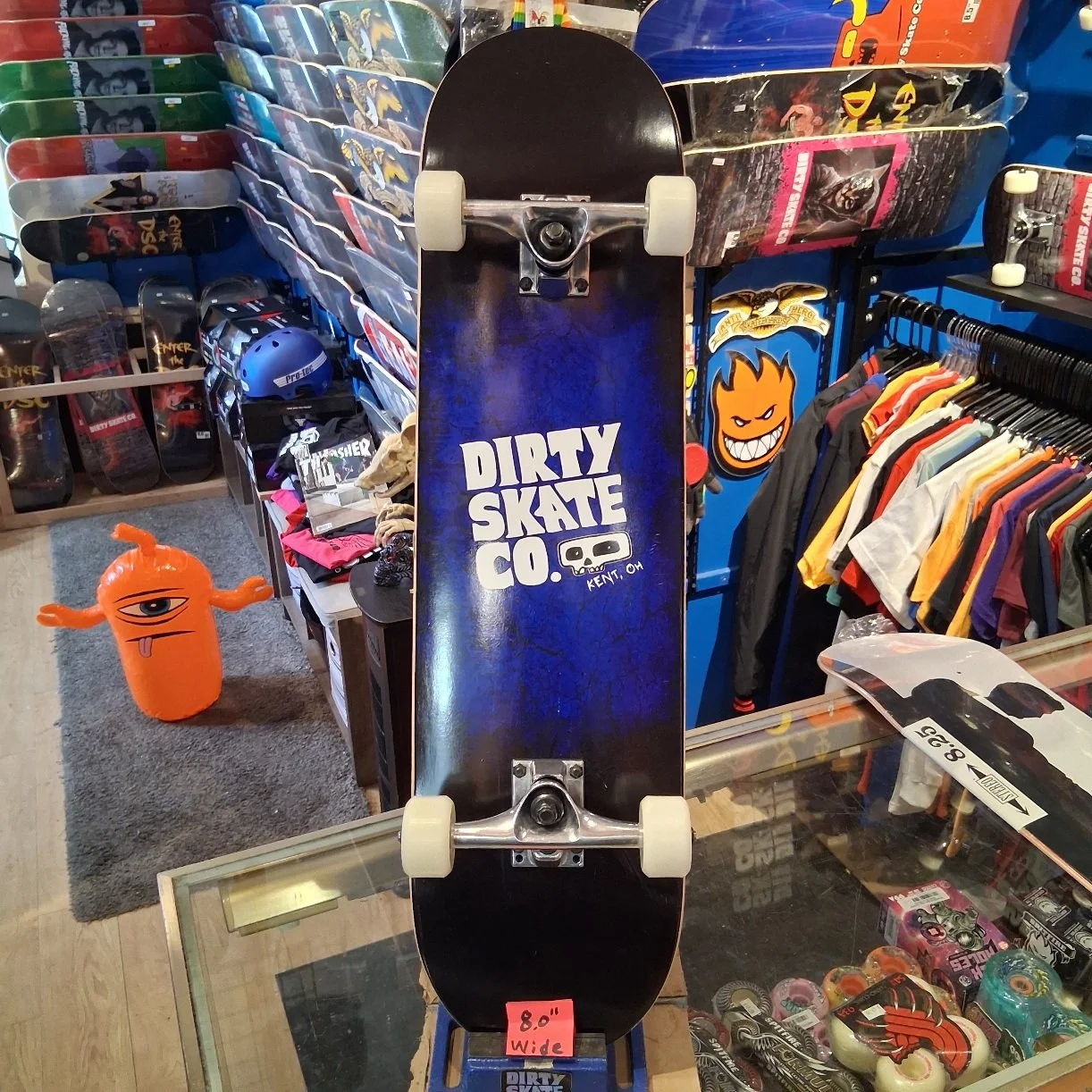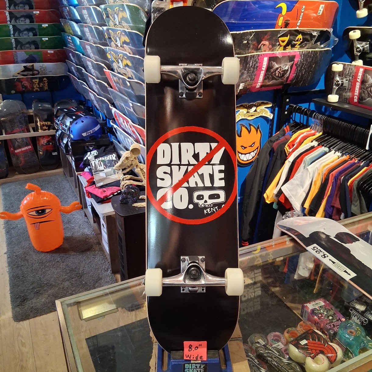 The Anti-Dirty Skate Co (8.0” wide) deck, blank trucks, 53mm Mini-Logo Wheels, 90a hardness, Mini-Logo Bearings, prebuilt complete