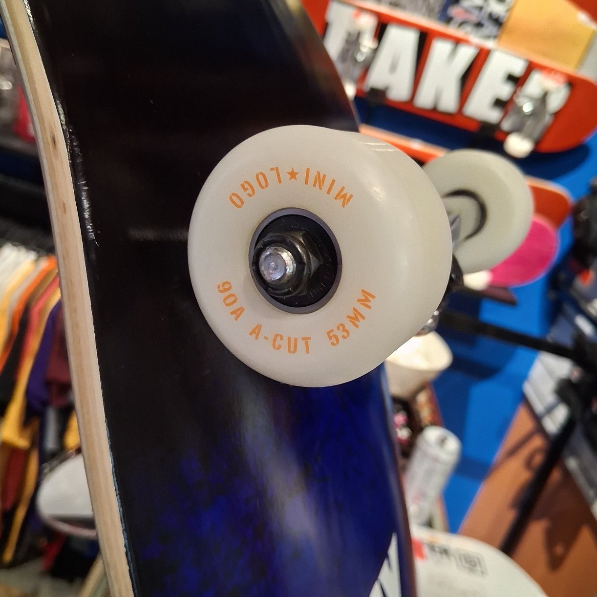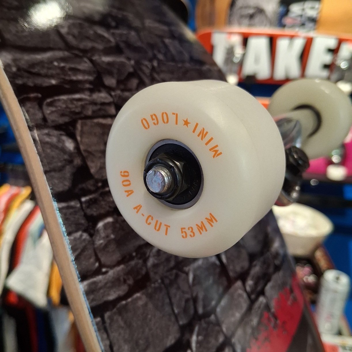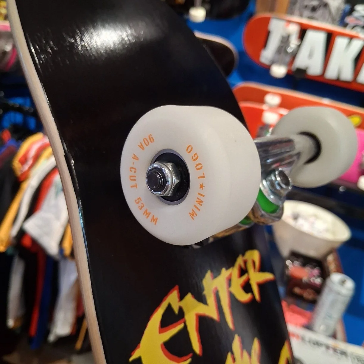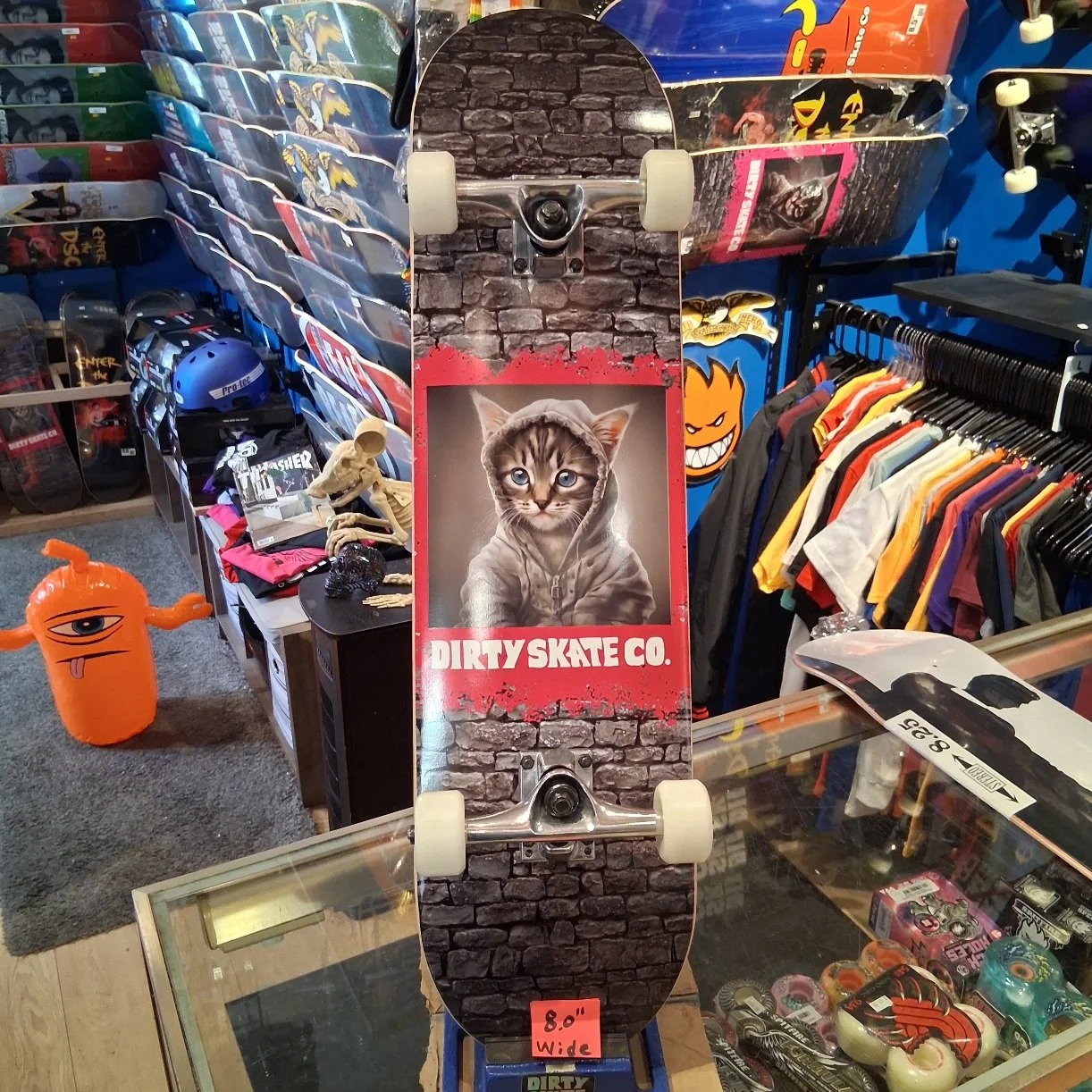 The Anti-Dirty Skate Co (8.0” wide) deck, blank trucks, 53mm Mini-Logo Wheels, 90a hardness, Mini-Logo Bearings, prebuilt complete
